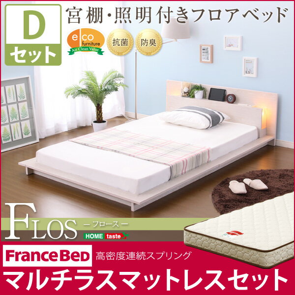 宮、照明、コンセント付きフロアベッド【フロース-FLOS-(ダブル)】(マルチラススーパースプリングマットレス付き)