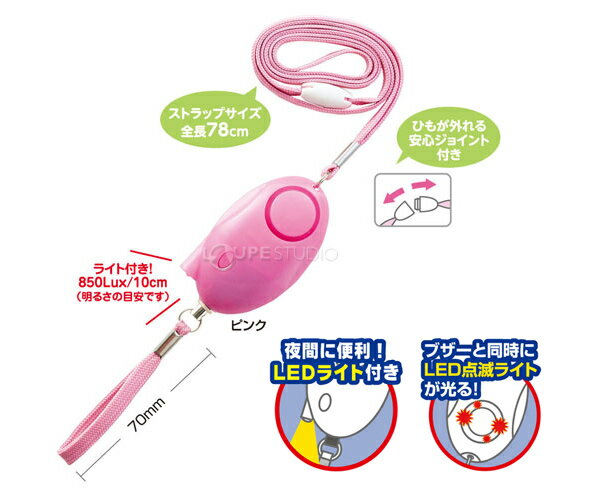 登下校時などに、身の危険を感じたら即時に警報!雨の日でも持ち歩ける生活防水タイプのブザー音と光で危険をお知らせる!夜間に便利!LEDライト付き! ブザーと同時にLED点滅ライトが光る! ひもが外れる安心ジョイント付き。